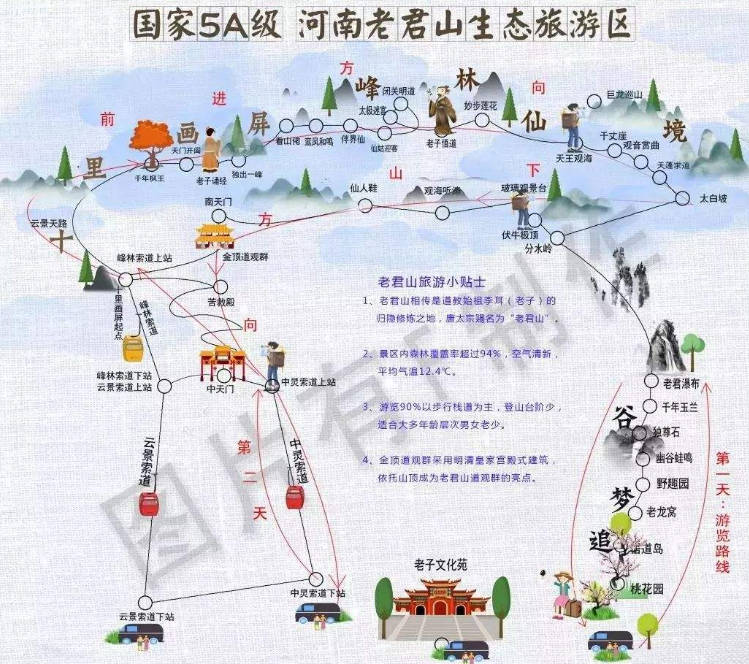 景区公共交通:到达洛阳龙门高铁站附近的客运站,乘坐到栾川县客车,全程高速2个小时到达,可路过老君山景区,在“老君山景区”下车,步行即可到达老君山票务中心。