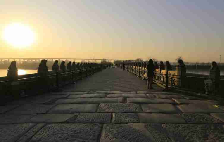卢沟桥位于北京西南广安门外30里的永定河上。有桥墩十座,共11孔,整个桥体都是石结构,关键部位均有银锭铁榫连接,为华北最长的古代石桥。特别是桥墩造法颇有特色,墩下面呈船形,迎水面砌作分水尖,外形像一个尖尖的船头,其作用为抗击流水的冲击。桥上的石刻十分精美,桥身的石雕护栏上共有望柱281根,柱高1.4米,柱头刻莲座,座下为荷叶墩,柱顶刻有众多的石狮。望柱上雕有大小不等、形态各异、数之不尽的石狮子。