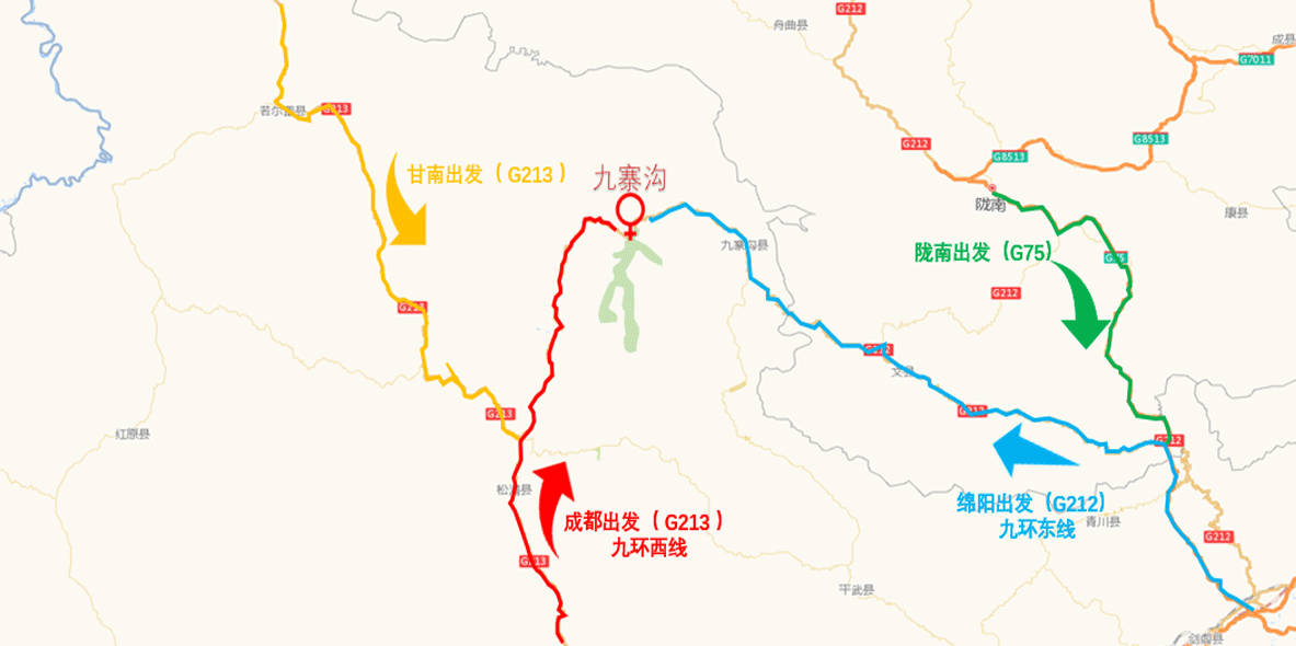 九寨沟的重要陆路交通分为东西环线。九环西线由成都出发,经都江堰、汶川、茂县、松潘至九寨沟,全程约440公里;九环东线由成都出发,经绵阳、江油、平武、九寨沟县城至九寨沟,全程约480公里。 另外,从甘肃省兰州市经过临夏、合作、碌曲、若尔盖、川主寺至九寨沟的公路也是近年颇受游客欢迎的自驾和乘车旅游线路,全程711公里。