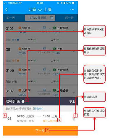 1、点击候补按钮,在【候补下单】中,就会加入出现该车次,可以点击右下角【候补下单】按钮查看候补列表,并且可以查看自己排在第几位。