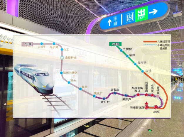 地铁在1号线【环球度假区】站与北京地铁七号线和八通线相连接。前往北京环球度假区的游客,可选择乘坐地铁在该站下车, 从B、C、D出站口步行约7分钟即可抵达北京环球城市大道入口安检处。