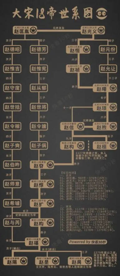 宋朝分为北宋和南宋,北宋为公元960年到公元1127年,共9位皇帝,南宋为公元1127年到公元1279年,共9位皇帝,宋朝公元960年建立,公元1276年灭亡,享国319年,共18带皇帝,那么宋朝都有哪些皇帝,下面就一块看下宋朝历代国君一览表吧,看看你都能记住哪些。