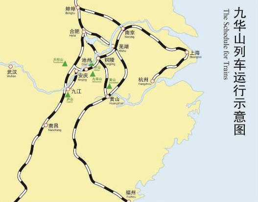 可乘列车至池州火车站、铜陵北火车站、合肥火车站后转车至九华山