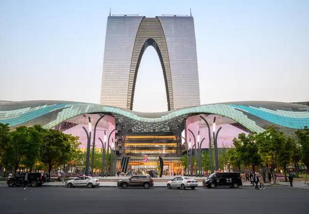 苏州中心广场紧挨东方之门,具有8项之最,规模最大的整体开发地下空间、空中生态花园、建筑地下交通网络、地下一体化停车场、城市综合体集中供冷供热系统、城市建筑基坑工程、单体购物中心。