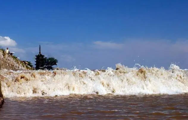4、长江口南海岸的长江水从钱塘江口进入,夹杂着海水的长江水会一波波地涌向钱塘江内部。