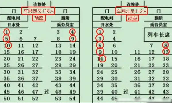 普通火车车厢前边一般都是门、配电间、厕所、开水处和乘务员室,车厢定员有118人的和112人,大多数普通火车都是定员118人,112人的是带有列车长办公室,一般长途车列车长办公席在8号车厢,短途车一般在5号。