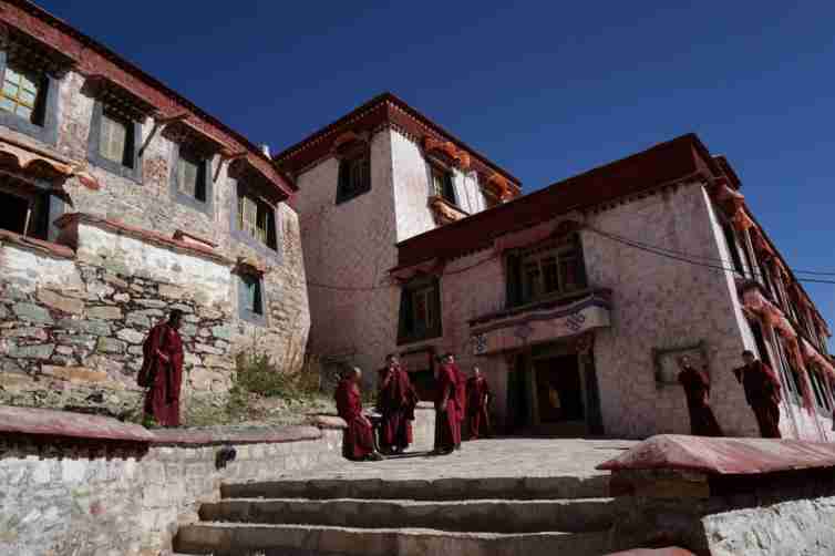 甘丹寺距离拉萨市区大概有60公里路,不是自驾的情况下,只能早上6点半前到大昭寺门口坐大巴车前去,记得当时整车人都是去朝拜的藏民,只有我们三个游客。当天来回,双程车费是40元/人,甘丹寺内也有旅馆但估计环境不好;进寺内不用门票。甘丹寺真的是很壮观,一大片红白相间的藏式建筑群座落在半山腰上,引得我们连连拍照。