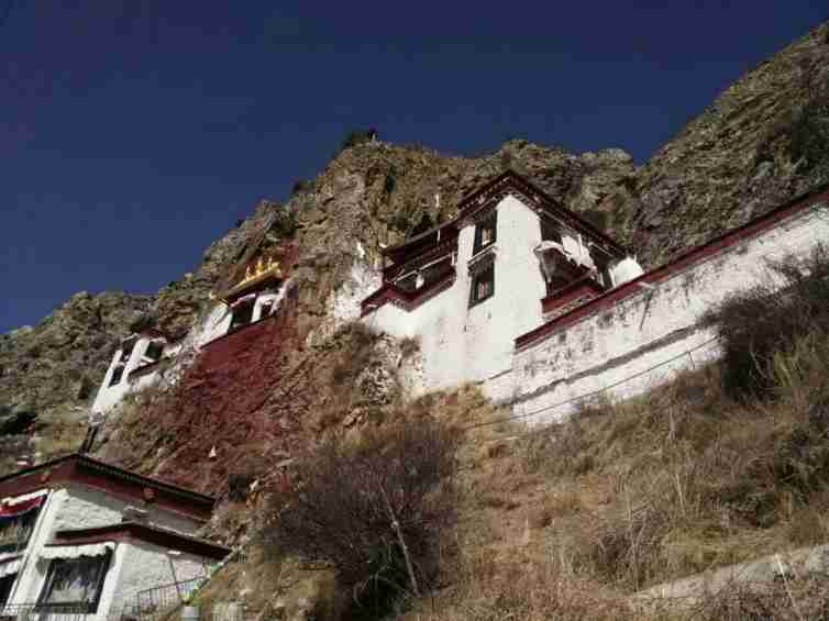 去扎耶巴寺同样是不容易的,距离拉萨市区约摸30公里,建议骑摩托车前往。盘旋在山路之间,风声在耳边疾驰而过,仿佛蓝天白云触手可及。这是一座镶嵌在崖洞之间的寺庙,最大的特色是以洞立寺,洞寺合一。