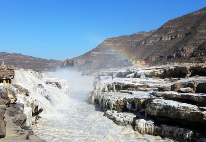3、秋天,壶口瀑布有慢慢安静下来,颜色也与周围景色融入进去了,反而游客变少了,岸边小溪汇集成清流流入壶口瀑布,伴有秋风出现彩虹,被叫作壶口秋风;